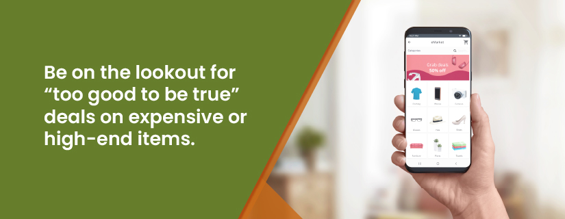 Be on the lookout for “too good to be true” deals on popular items such as mobile devices, video game systems, toys, and more. You may receive these offers via email, text message, or on social media. Searching for a specific item may also return ads for suspiciously low prices.