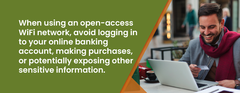 While all public WiFi networks pose some risk, hotel networks have become a top target of hackers. When using an open-access WiFi network, avoid logging in to your online banking account, making purchases, or potentially exposing other sensitive information.