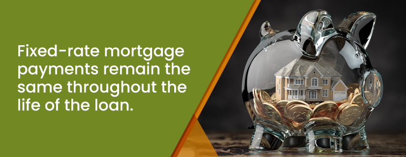 Also known as a conventional mortgage, a fixed-rate home loan maintains the same interest rate through the life of the loan. This means that your monthly mortgage payment will stay the same as well.