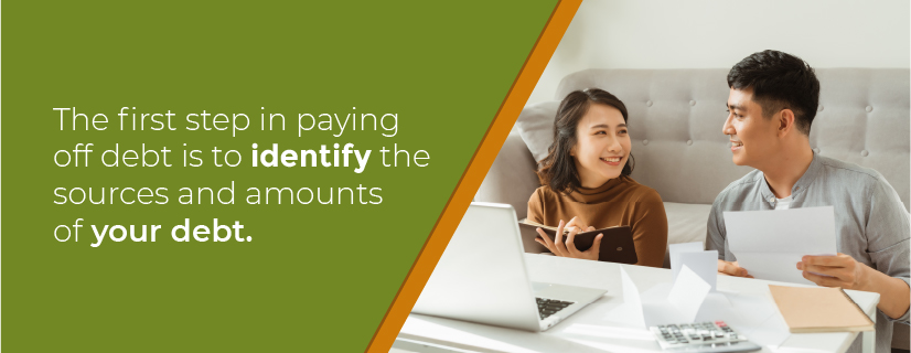 If you’re wondering how to pay off debt, the first step is to identify the sources and amounts of your debt. Credit cards, a mortgage, student loans, car loans, and medical bills are all common sources of debt.