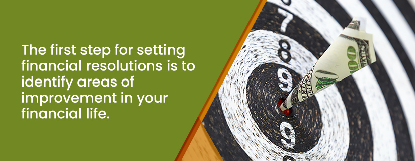 The first step for setting financial resolutions is to identify areas of improvement in your financial life. We recommend doing an annual financial checkup to find out where you are doing well and where you could do better. Examples of financial goals for the coming year include: