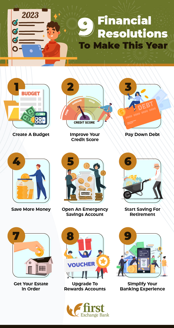 There is nothing like a new year to bring a sense of fresh starts and wide-open possibility. As you think about the new year’s resolutions you want to make, don’t forget to include financial resolutions as well. A new year is also a good time to improve your finances, so keep reading for a list of financial resolutions that could help you reach your goals this year.