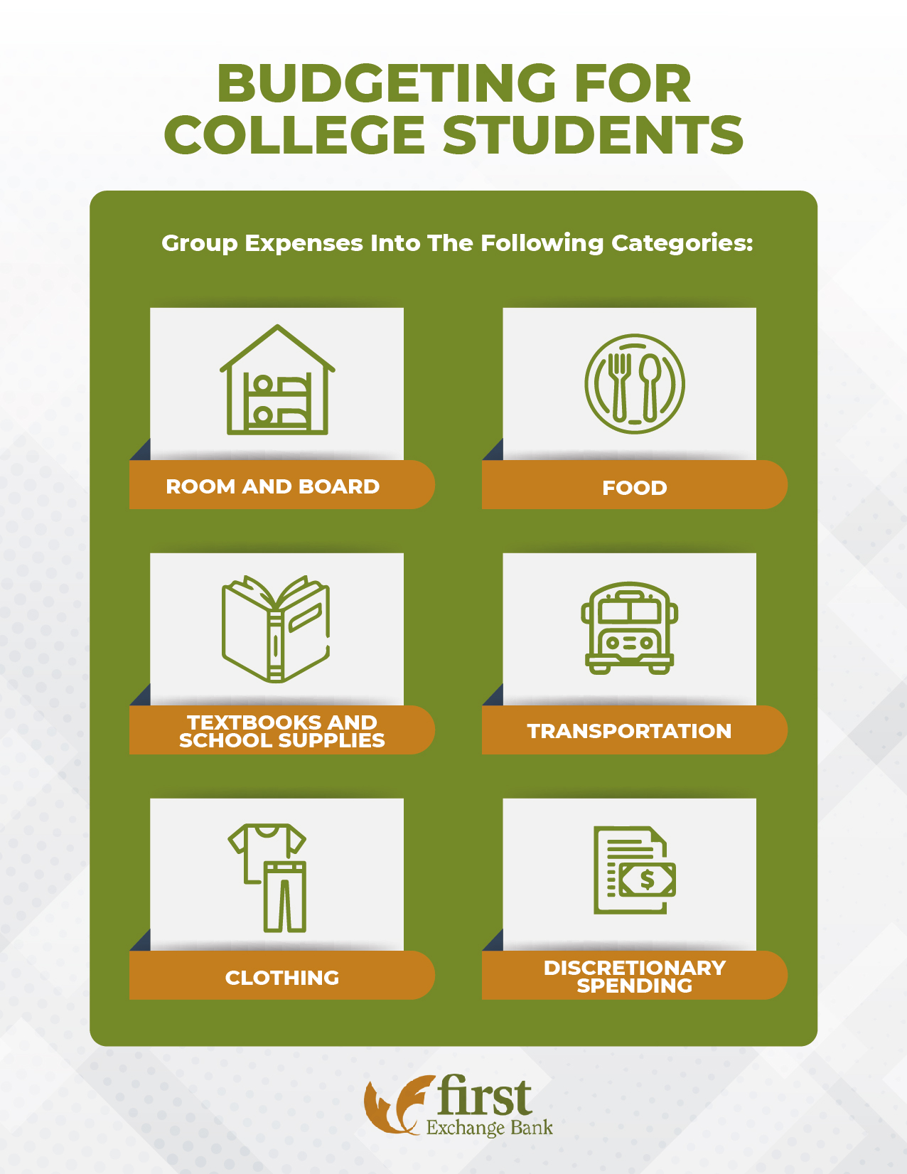 At First Exchange Bank, we are here to help you and your student navigate those tenuous college years by taking the guesswork out of smart financial management. Our student and family-centered products from student checking to personal savings accounts, as well as our Visa® Rewards Platinum credit card with travel and merchandise rewards, can give your student the tools needed to budget, plan for the future, and build a strong financial history that will benefit them for years to come.