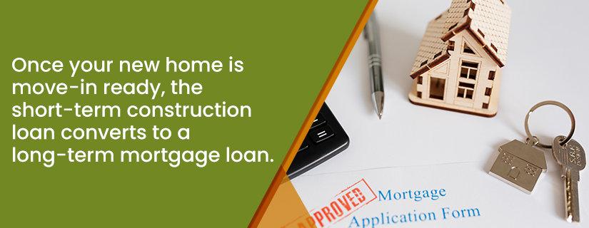 - Construction-only: This type of financing must be refinanced or paid off once the construction process is complete. After the construction process is complete or a predetermined time lapses (generally nine to twelve months) you will need to pay your construction loan balance in full. If you are selling another house, you may be able to use the proceeds to pay off your construction loan. Otherwise, you will need to apply for a traditional mortgage, which includes an application and a second loan with closing costs to payoff your construction-only loan.